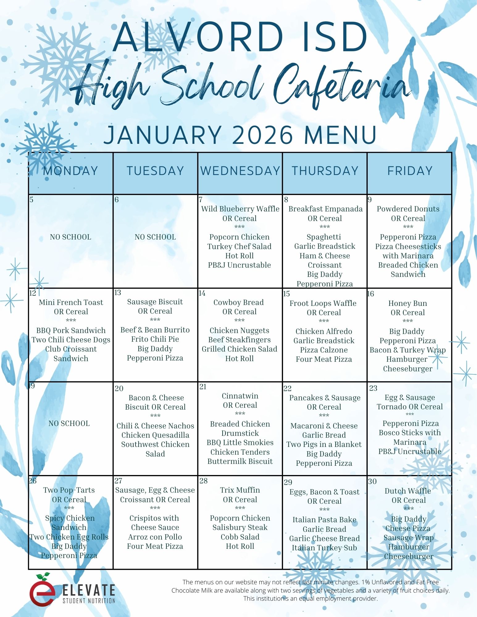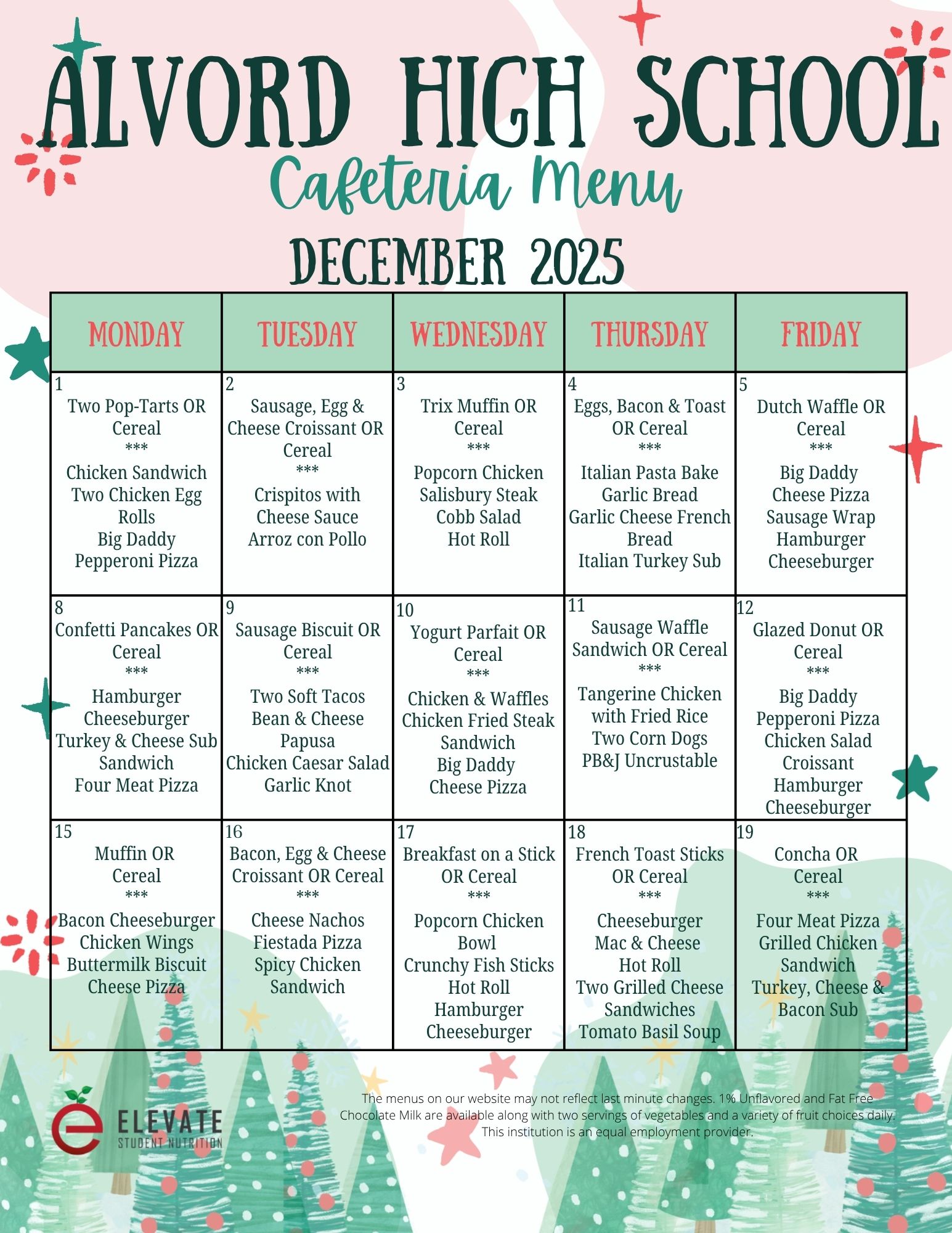 Welcome to the Alvord High School Lunchroom page. We look forward to serving our students a well balanced nutritional meal that meets the Texas Department of Agriculture's Texas Public School Nutrition Policy. Our cafeteria is offer vs. serve, which means that we offer at least five qualifying food items to each student and they may choose all or at least three and one being a fruit or vegetable for the tray to qualify for the state's nutritional guidelines.